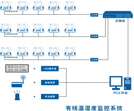 方案采用分布式智能網(wǎng)絡(luò)型監(jiān)控系統(tǒng),采用485總線技術(shù)、以太網(wǎng)技術(shù)等傳輸方式,被監(jiān)控的點(diǎn)位可根據(jù)需要擴(kuò)展硬件種類,增加監(jiān)控點(diǎn)數(shù)量,監(jiān)控終端采用普通的PC電腦?;诂F(xiàn)場(chǎng)總線的方式的傳輸,采用智能溫濕度記錄變送器,便于現(xiàn)場(chǎng)布線,記錄平臺(tái)采用PC計(jì)算機(jī),支持?jǐn)?shù)據(jù)導(dǎo)出和以太網(wǎng)傳輸,及無(wú)線傳輸。軟件界面圖形化,采用大型數(shù)據(jù)庫(kù)進(jìn)行溫濕度記錄的存儲(chǔ),并且數(shù)據(jù)可以手動(dòng)或自動(dòng)進(jìn)行備份。動(dòng)態(tài)數(shù)據(jù)庫(kù)技術(shù)保證海量數(shù)據(jù)壓縮存儲(chǔ)需要的同時(shí)可以迅速查詢。根據(jù)數(shù)據(jù)庫(kù)服務(wù)器硬盤的大小,歷史數(shù)據(jù)一般可以保存十年以上。將每一臺(tái)設(shè)備的實(shí)時(shí)溫(濕)度數(shù)據(jù)在監(jiān)控電腦上進(jìn)行顯示與記錄。通過友好的軟件界面可任意設(shè)定每個(gè)區(qū)域的溫(濕)度上下限以及報(bào)警方式,報(bào)警信息由短信報(bào)警器發(fā)送至多個(gè)管理員手機(jī)。