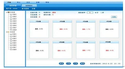 (3) 平臺(tái)的實(shí)時(shí)監(jiān)測(cè)界面,可隨時(shí)查看各個(gè)監(jiān)測(cè)點(diǎn)的溫濕度、溫濕度數(shù)據(jù),并可查看斷電情況和人員報(bào)警情況,數(shù)據(jù)更新時(shí)間可自行設(shè)定。