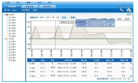 (4)數(shù)據(jù)查看界面,可查看歷史曲線和歷史數(shù)據(jù)列表,并可保存和打印。